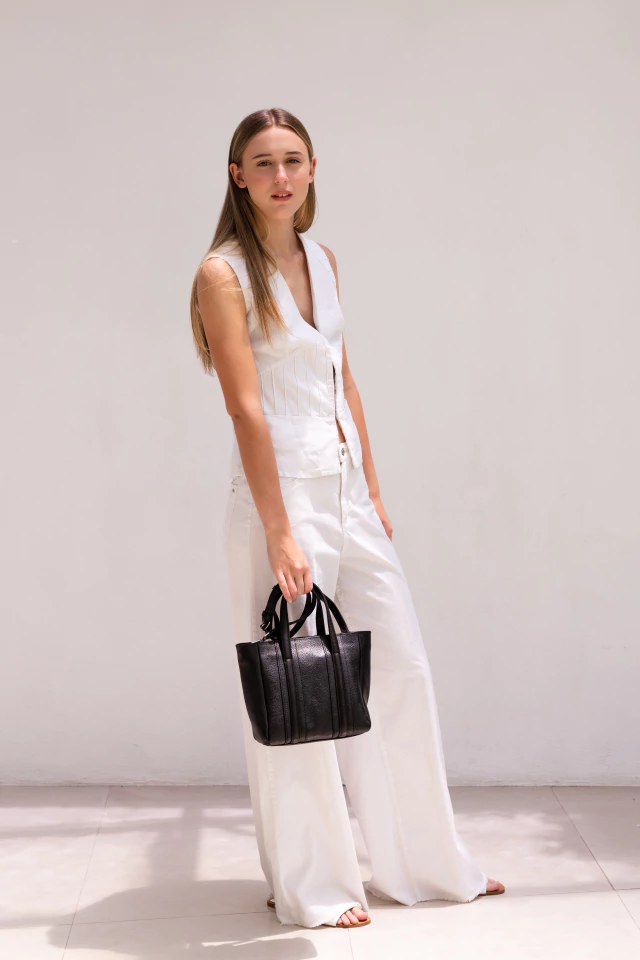Bandolera mediana de cuero vacuno. Se accede mediante un cierre metálico. El interior está forrado con gabardina y tiene un bolsillo interno con cierre.